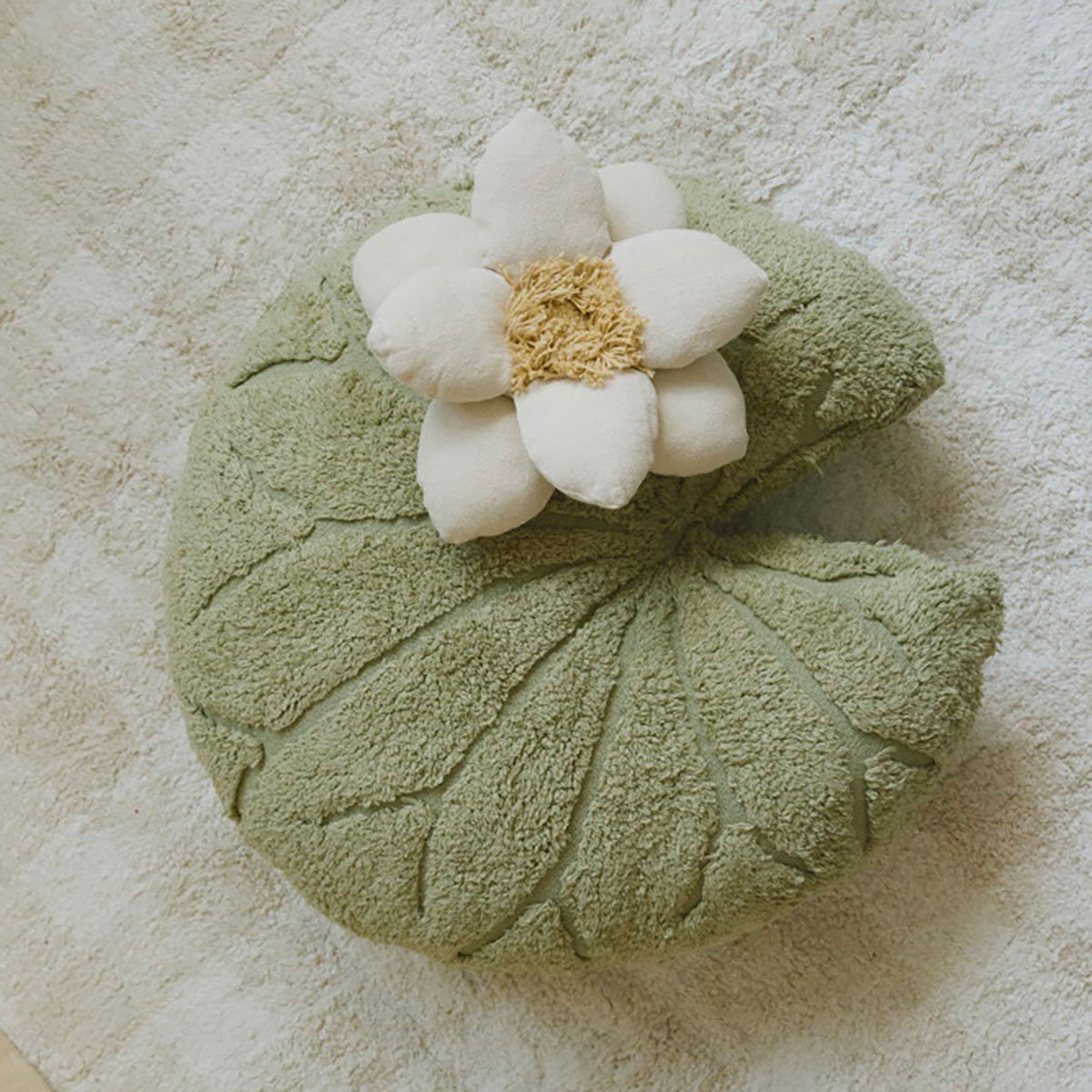 Almofada de chão tipo Puff (2 em 1) em formato de Vitória-régia. Feita em lona de algodão resistente tons Matcha. Tamanho 60x60cm. Capa lavável.