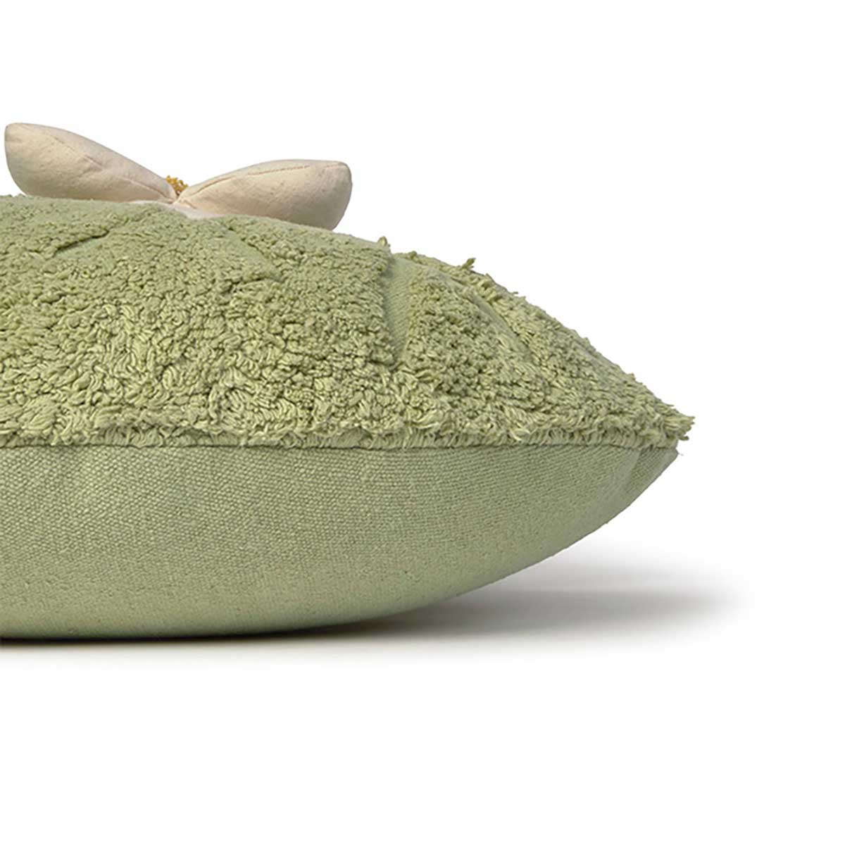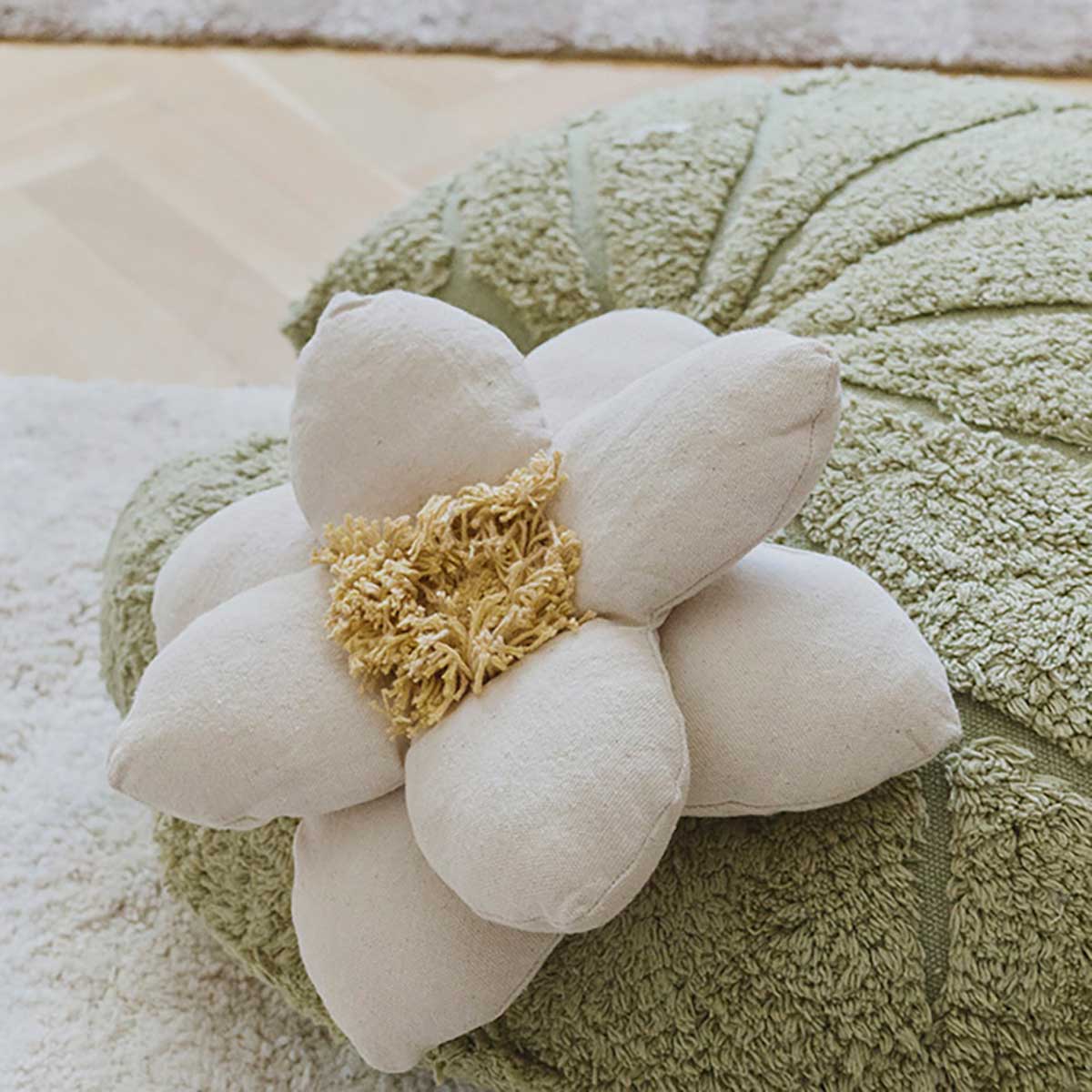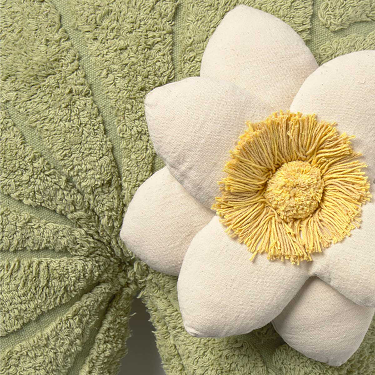 Feita inteiramente em lona resistente em tons matcha suaves. Design 2 em 1: almofada e puff. O centro da flor possui detalhes visíveis em lona, criando uma peça original e artesanal.