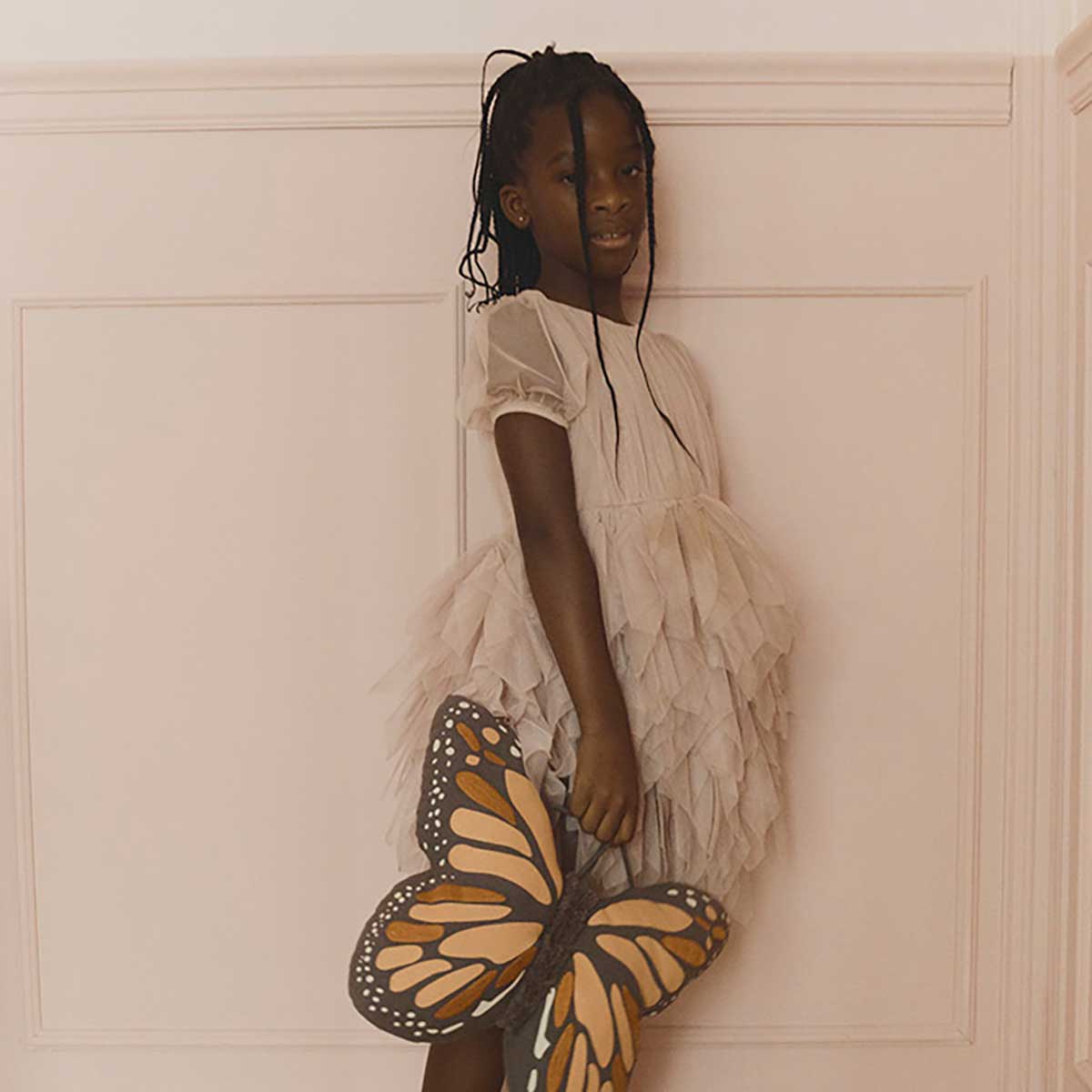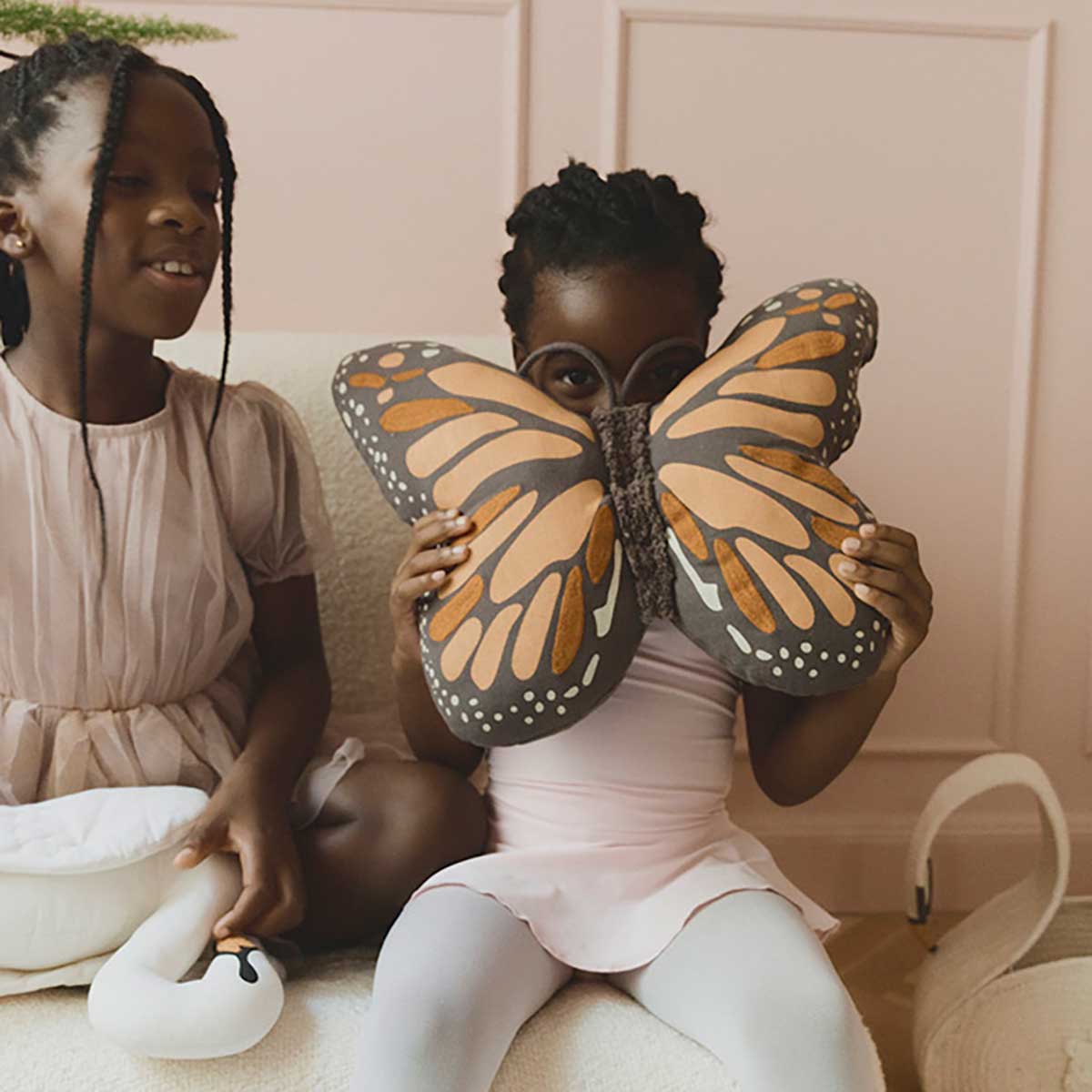 Almofada borboleta com tecido tufted macio, estampas lúdicas e bordados delicados. As antenas e o corpo colorido convidam à imaginação.