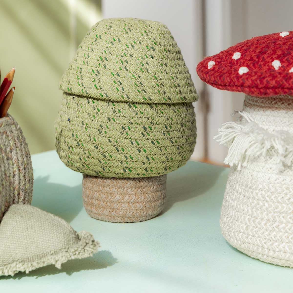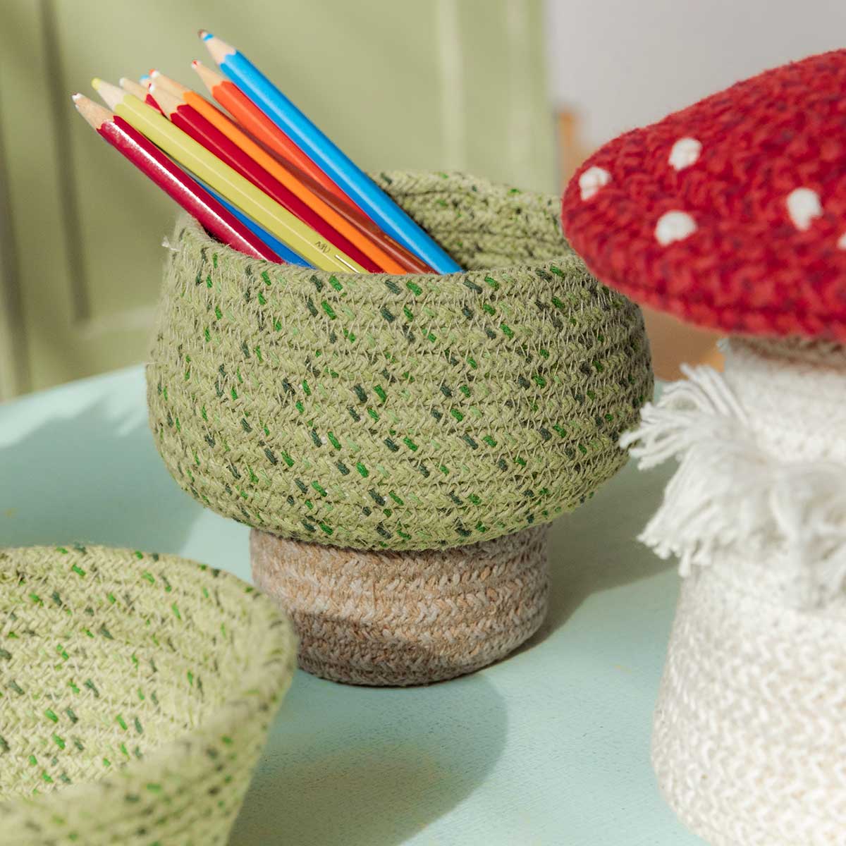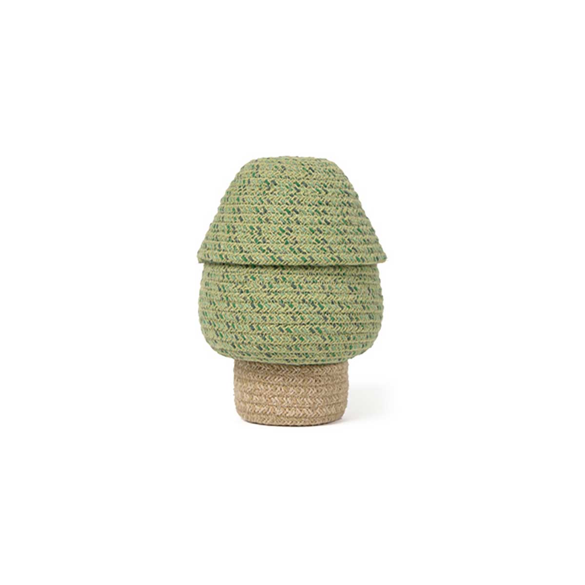 Feito à mão com cordas trançadas feitas de fibras de garrafas PET recicladas, tingidas e misturadas com nosso algodão, proporcionando maior rigidez ao produto. O fio combina tons de verde e azul no tronco, criando uma textura única e vibrante. Pela primeira vez, o interior foi preenchido com materiais sobressalentes, adicionando estabilidade e estrutura extra à peça. Cores: Amêndoa, Fio reciclado amarelo, Verde Matcha, Verde Médio, Verde. Composição: 55% algodão, 30% fibras de poliéster de PET recicladas, 15% outras fibras