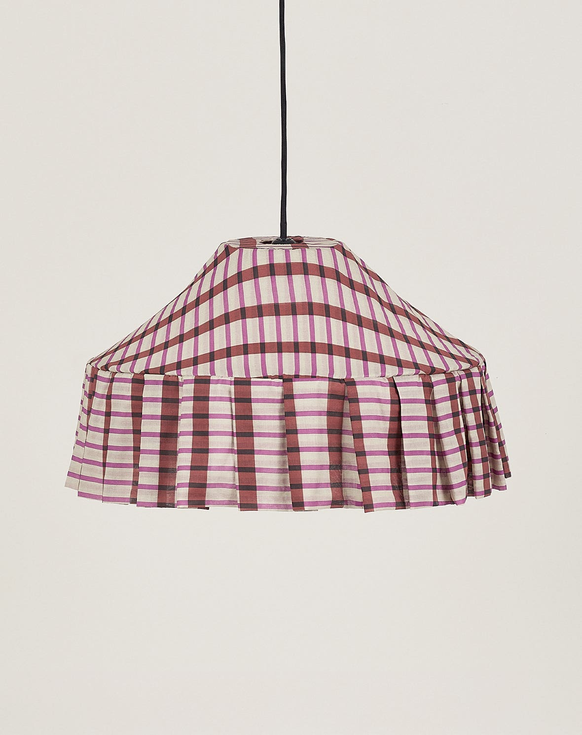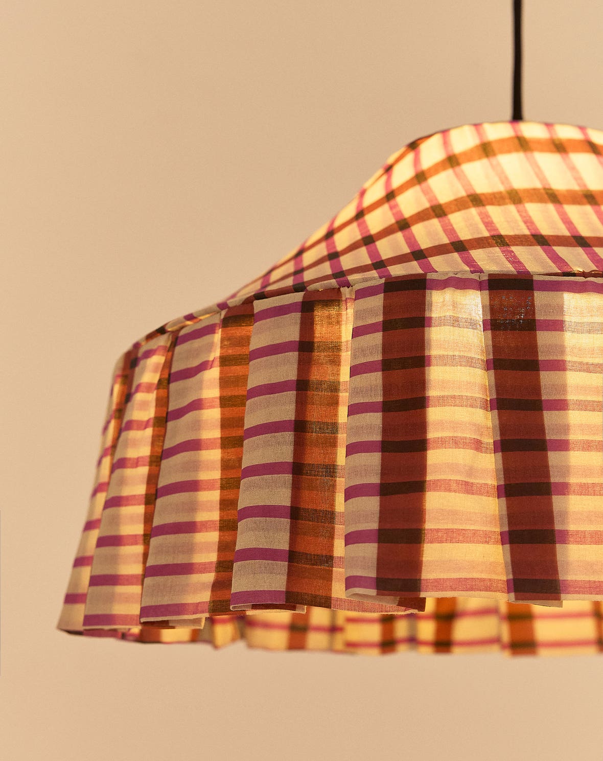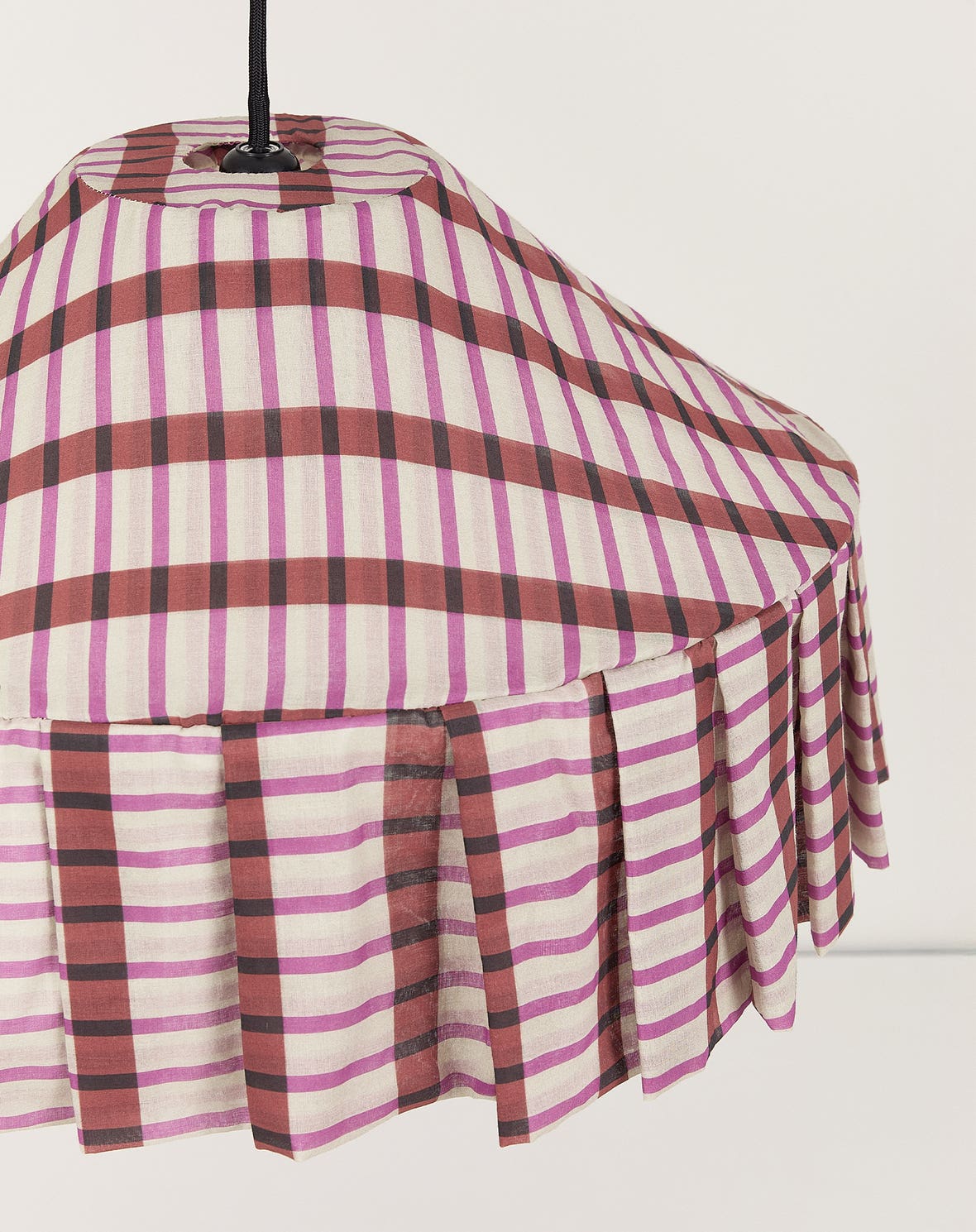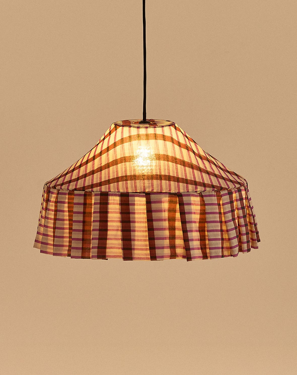 Elegância Plissada para Mesas de Jantar O lustre Nicole é a escolha ideal para iluminar mesas de jantar ou criar um ambiente sofisticado sobre poltronas de leitura. Sua cúpula em voile de algodão estampado e plissado confere um ar retro e artesanal, proporcionando uma luz suave e otimista para a casa. Com um diâmetro de 50 cm, ele funciona como uma peça central de design que combina materiais nobres e acabamento impecável, típicos da curadoria Momy & Co.