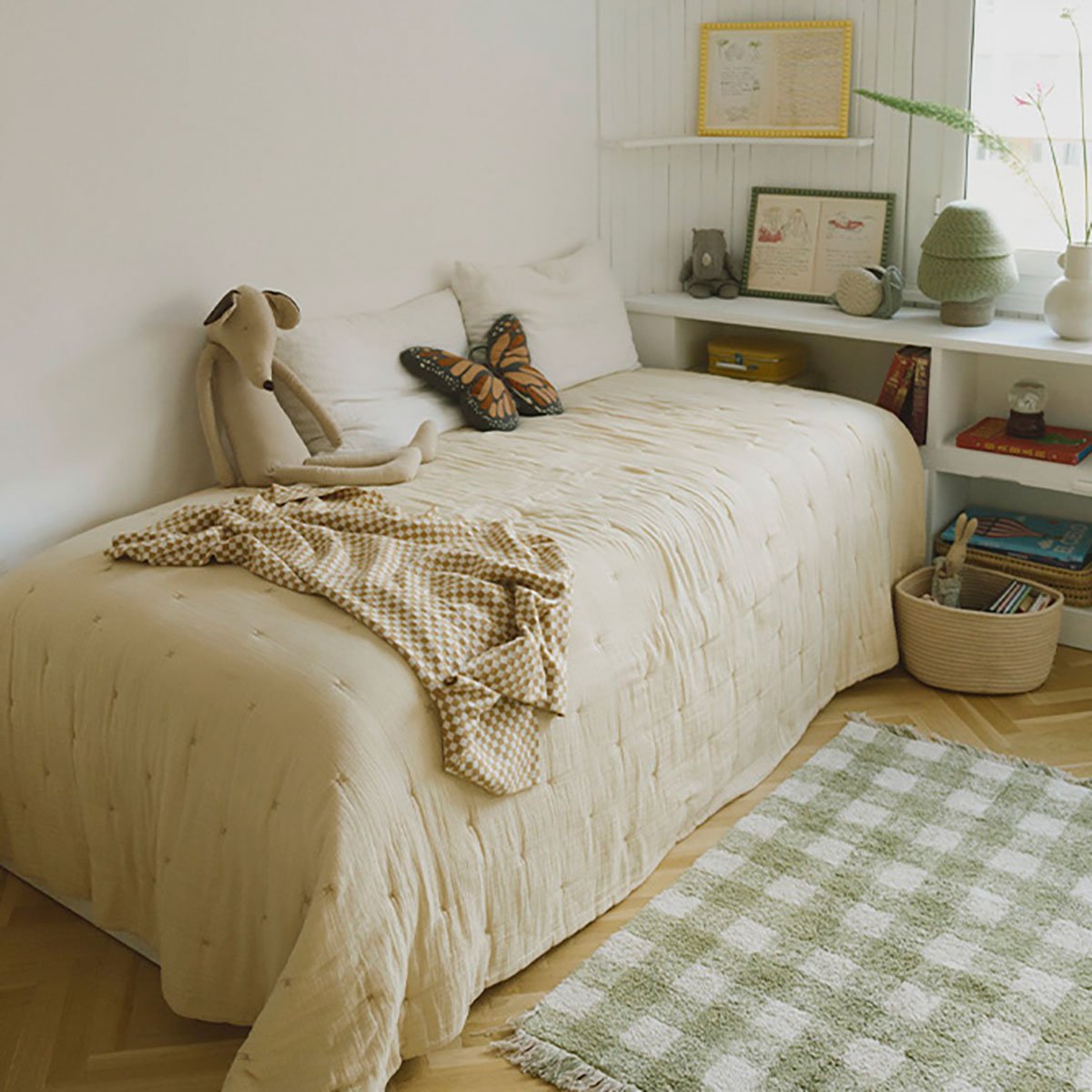 Aconchegue seu pequeno com a maciez da nossa Manta Tricotada Tiles na cor Honey. Ideal para berços ou camas infantis, combina perfeitamente com nosso icônico tapete e puff Tiles, criando um cantinho lúdico e acolhedor.