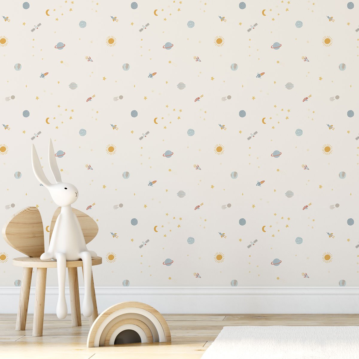 O papel de parede Espaço tem os elementos miudinhos com fundo colorido e nos leva para uma viagem ao espaço.