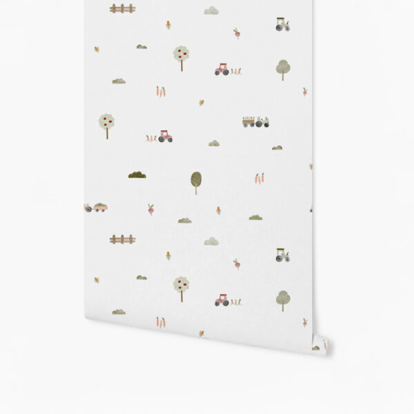 O papel de parede Fazendeiro conta com tratores e pequenas plantações, num layout delicado para quem ama estampas minimalistas mas não abre mão do estilo e personalidade.