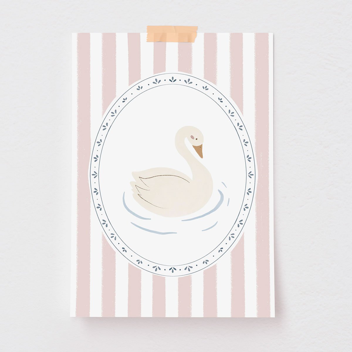 Pôster infantil com cisne gracioso. Ideal para decoração de quarto de bebê ou criança, trazendo leveza e poesia.