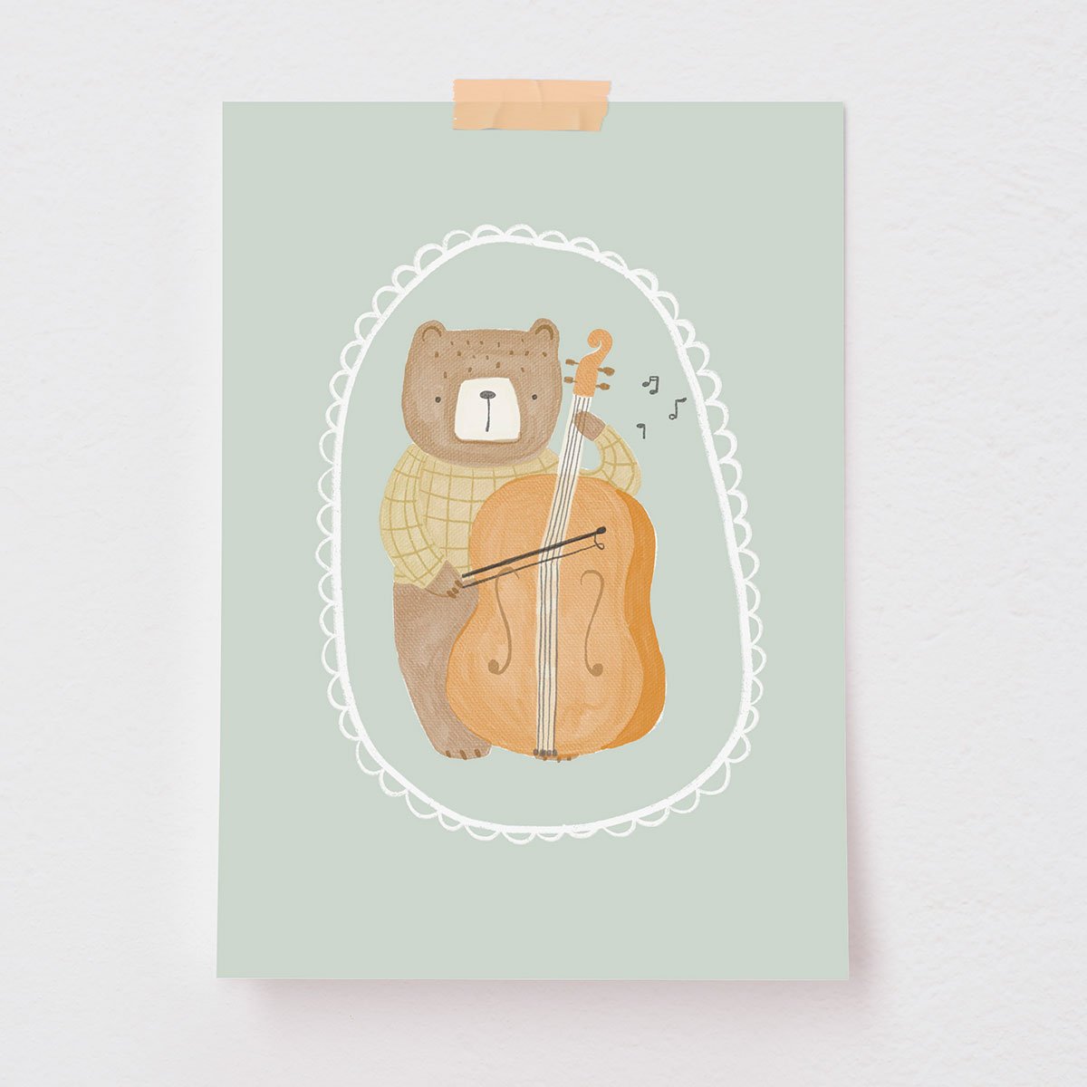 A Orquestra dos Bichos toma o palco da noite. O poster Urso Musical é um romantico Urso que emociona a todos com seu violoncelo. seus pratos, traz emoção à noite.