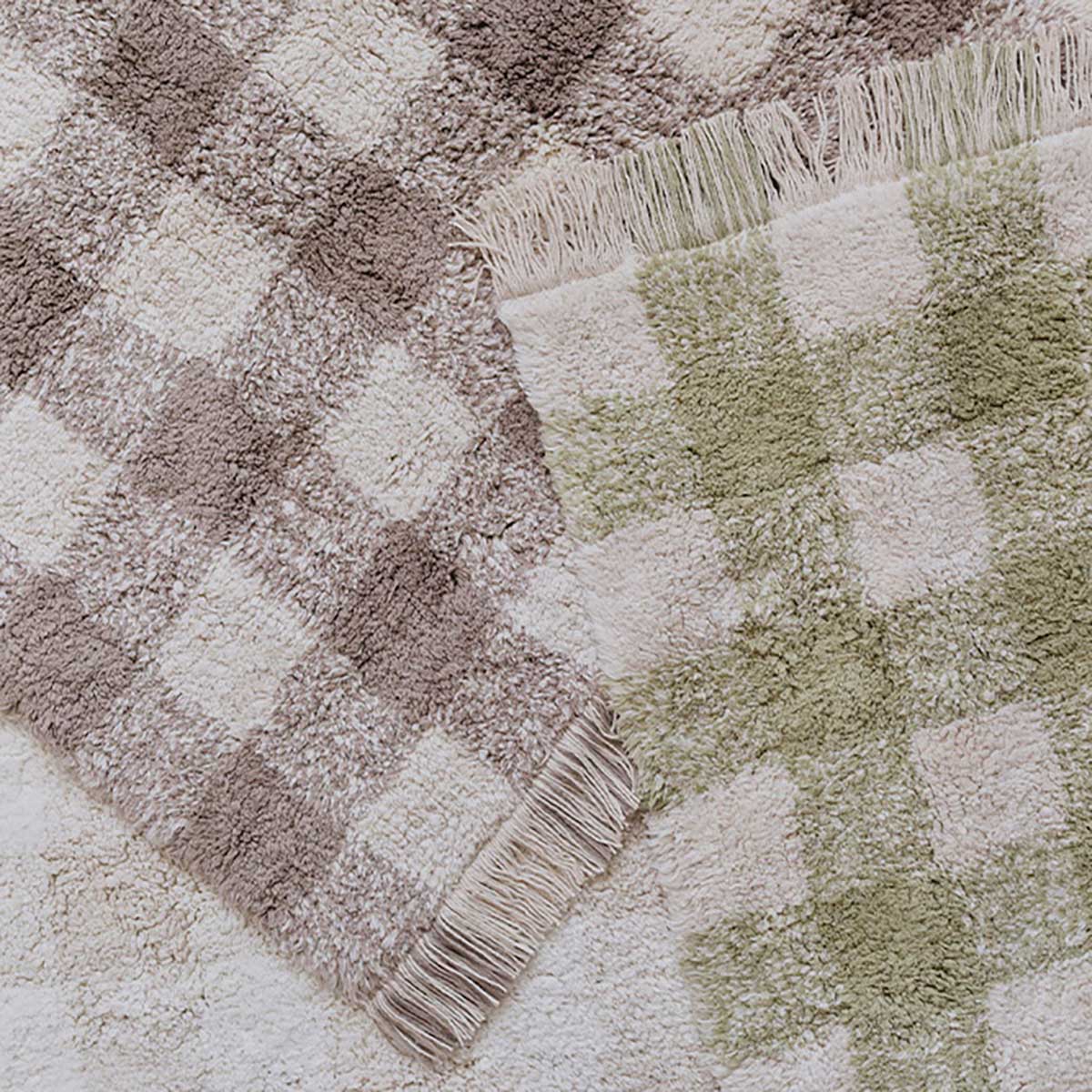 Tapetes laváveis em padrão vichy com franjas divertidas. Combinações perfeitas com os puffs e mantas da mesma linha. Um design atemporal com toque moderno.