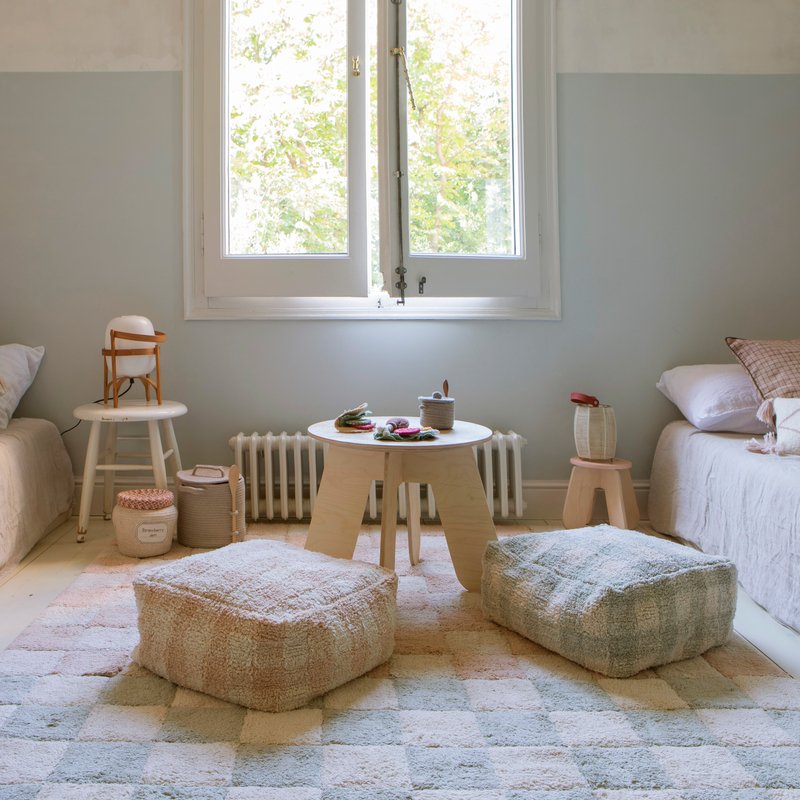 Inspirado em pisos de cerâmica vintage, o tapete Kitchen Tiles apresenta um padrão xadrez jogando com cores Natural e Azul Sálvia contrastantes. O tapete utilizou a nossa mistura de RugCycled- base de lona Natural, deixando a base levemente visível entre os quadrados coloridos que simulam os azulejos de cozinha.