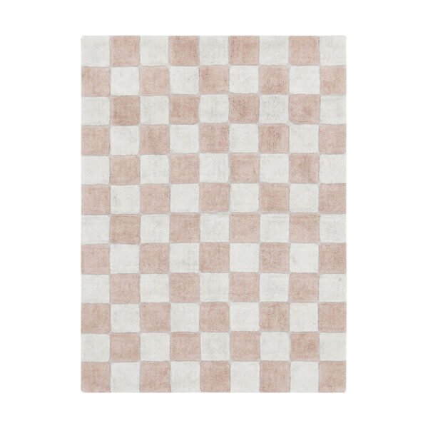 Inspirado em pisos de cerâmica vintage, o tapete Kitchen Tiles apresenta um padrão xadrez jogando com cores Natural e Rosa contrastantes.